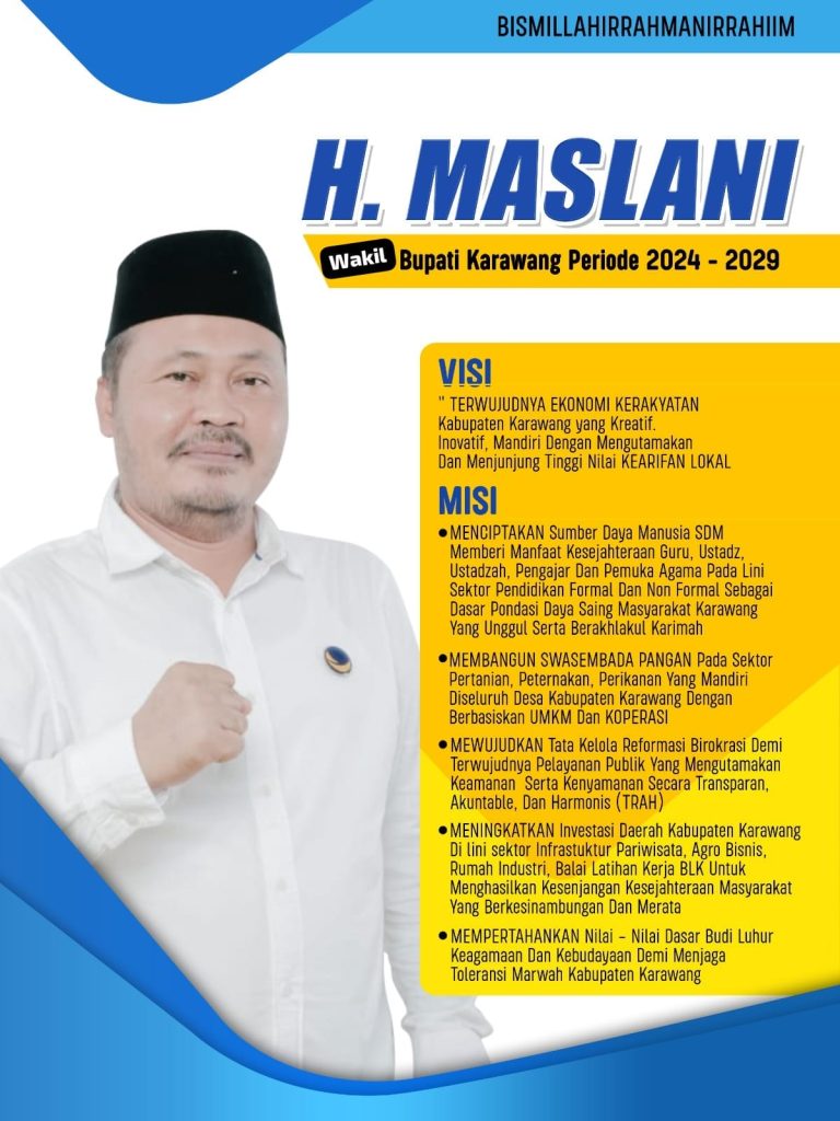 Bahkan disamping itu, Misi dari Paslon H Aep – H Maslani lebih jelas lagi, dengan menciptakan Sumber Daya Manusia , memberikan manfaat kesejahteraan guru, Ustad/Ustadzah, pengajar serta para pemuka Agama se-Kabupaten Karawang.