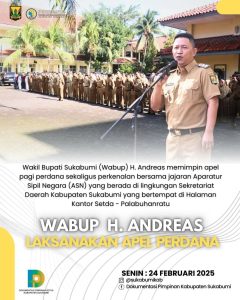 Sukabumi, SWARA JABAR – Wakil Bupati Sukabumi (Wabup) H. Andreas memimpin apel pagi perdana sekaligus perkenalan bersama jajaran Aparatur Sipil Negara (ASN) yang berada di lingkungan Sekretariat Daerah Kabupaten Sukabumi yang bertempat di Halaman Kantor Setda – Palabuhanratu, Senin (24/2/2025).