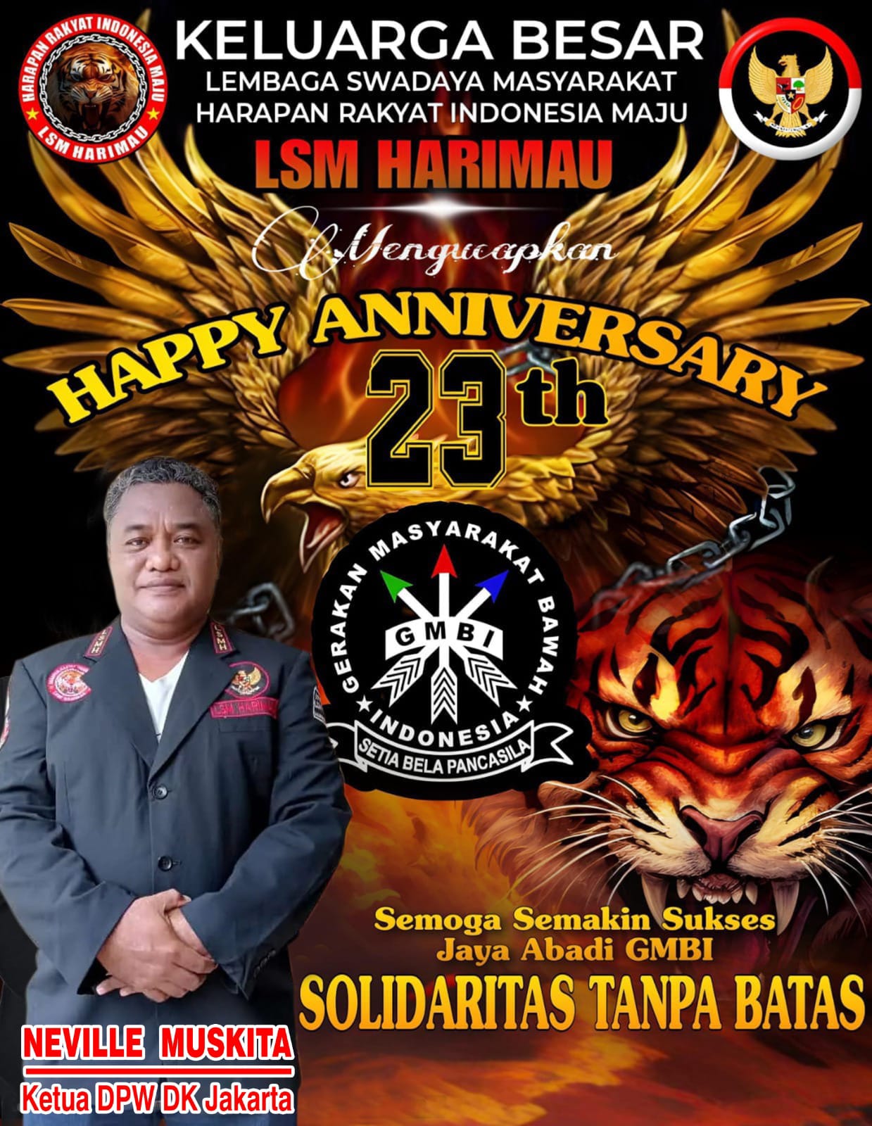 Dalam pernyataannya, H. Nevile Muskita menegaskan bahwa HUT GMBI bukan sekadar seremonial, melainkan refleksi perjuangan panjang untuk membumikan nilai-nilai keadilan sosial dan persatuan. “Atas nama keluarga besar HARIMAU, saya mengucapkan *Barakallah Fii Umrik* ke-23 untuk GMBI. Semoga Allah SWT senantiasa memberkahi perjuangan GMBI dalam mengawal cita-cita luhur Pancasila,” ujarnya dengan penuh haru.