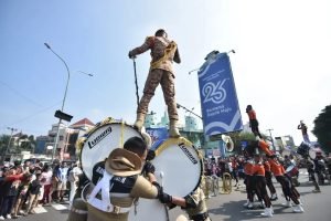 Tiba di Simpang Ramanda, para personel GAP menampilkan atraksinya dalam memainkan alat  musik yang disambut  antusias dan meriah oleh warga dan pengendara yang melintas di Jalan Margonda Raya untuk mendokumentasikan momen peringatan HUT Kota Depok yang ke-26 ini.(Bro)