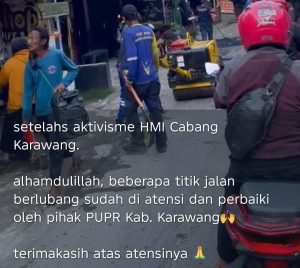 “Setelah Aktivisme HMI Cabang Karawang. Alhamdulillah, beberapa titik jalan berlubang sudah diatensi dan diperbaiki oleh pihak PUPR Kabupaten Karawang. Terima kasih atas atensinya,” tulis Reza dalam unggahan Story WhatsApp-nya, Rabu (9/7/2025) sore.