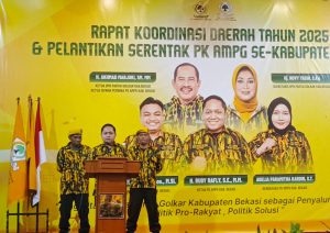 Bekasi – Ketua Pimpinan Daerah Angkatan Muda Partai Golkar (AMPG) Kabupaten Bekasi, Rudy Rafli,.S.E,.M.M,. tampil tegas dan berwibawa saat memimpin Pelantikan Serentak PK AMPG se-Kabupaten Bekasi yang berlangsung di Hotel Syahid, Sabtu (27/9/2025).
