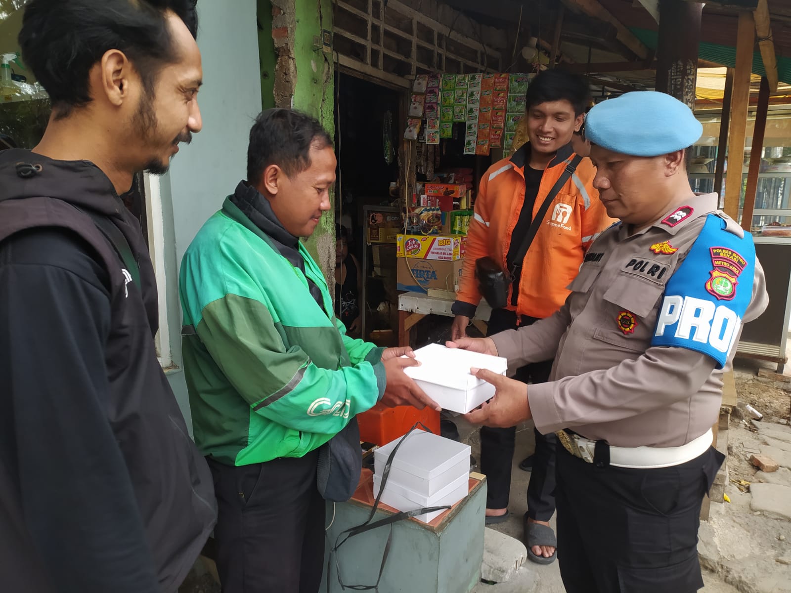 Selain memberikan bantuan, jajaran Polsek juga menyempatkan diri berbincang hangat dengan para pengemudi ojek online. Dalam kesempatan itu, petugas menyampaikan pesan-pesan Kamtibmas agar para pengemudi selalu menjaga keselamatan berkendara, tertib berlalu lintas, serta ikut berperan aktif menjaga keamanan di lingkungan masing-masing.