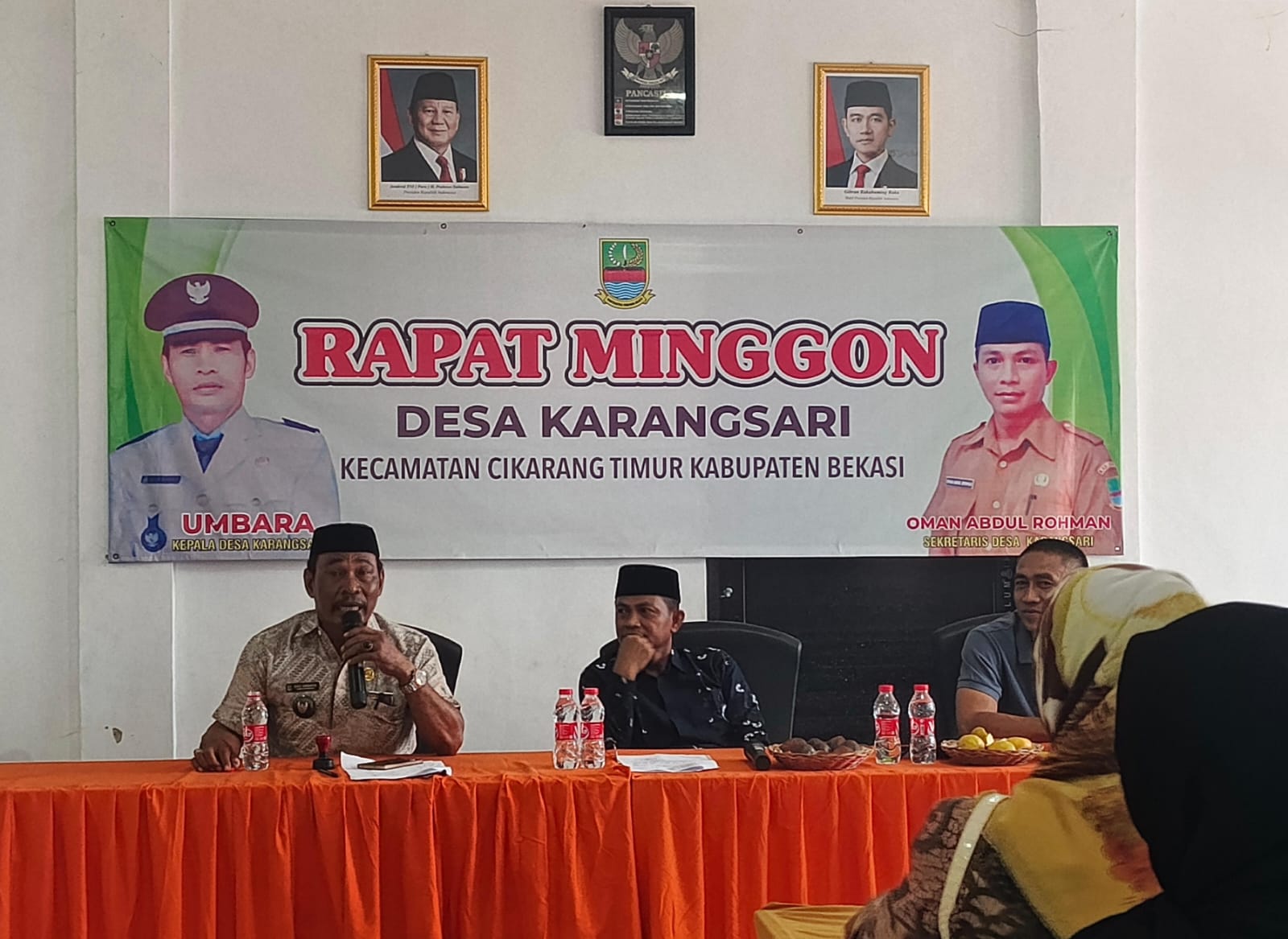 Bekasi/Karangsari — Rapat Minggon Desa Karangsari yang digelar pada Kamis (27/11/2025) di Aula Kantor Desa Karangsari, Kecamatan Cikarang Timur, berlangsung penuh kedisiplinan dan nuansa kebersamaan. Rapat dipimpin langsung oleh Kepala Desa Karangsari, H. Bao Umbara, sosok pemimpin yang dikenal berintegritas tinggi, tegas, karismatik, serta memiliki kepedulian mendalam terhadap masyarakat dan kemajuan program pemerintahan desa.