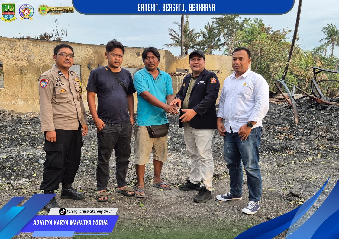 Didampingi Bendahara Karang Taruna Kecamatan Cikarang Timur Dian Tardiana, Ketua Karang Taruna Desa Hegarmanah Nursidik alias Menir, Ketua Forum BPD Kecamatan Cikarang Timur Ahmad Alamsyah, serta Bhabinkamtibmas Desa Hegarmanah Aipda Ropi, Jajang Nurjaya hadir menyambangi para korban yang masih berjuang menata kembali kehidupan setelah api melalap tempat tinggal mereka.